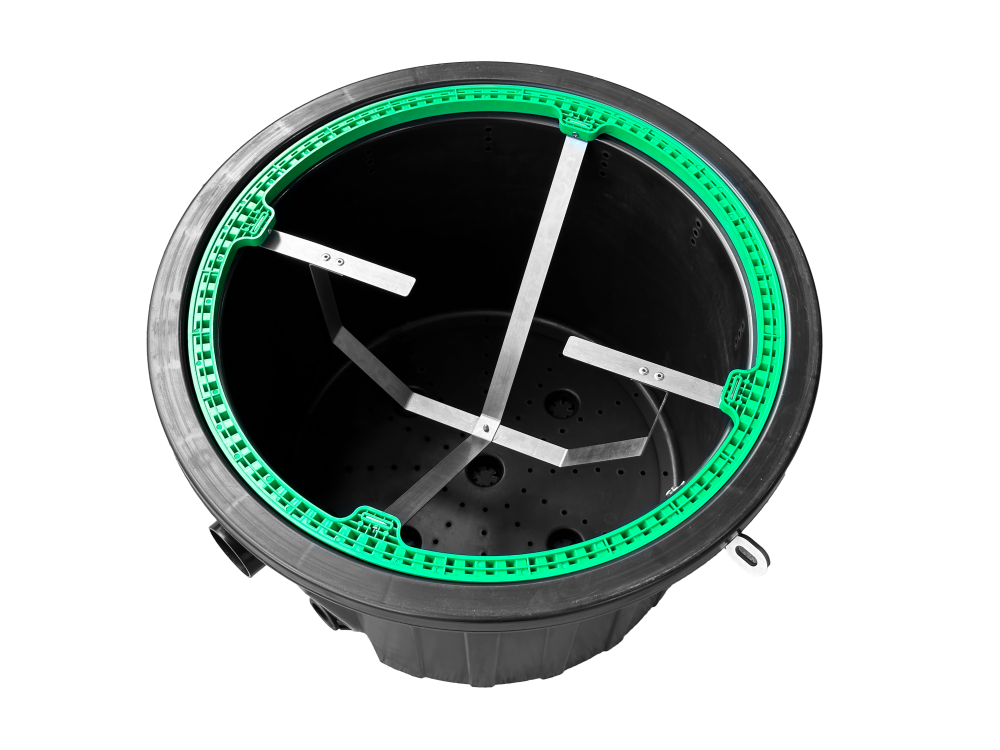 The base of the internal chamber allows for the reabsorption of excess liquid back into the composting pile, optimising the moisture level.